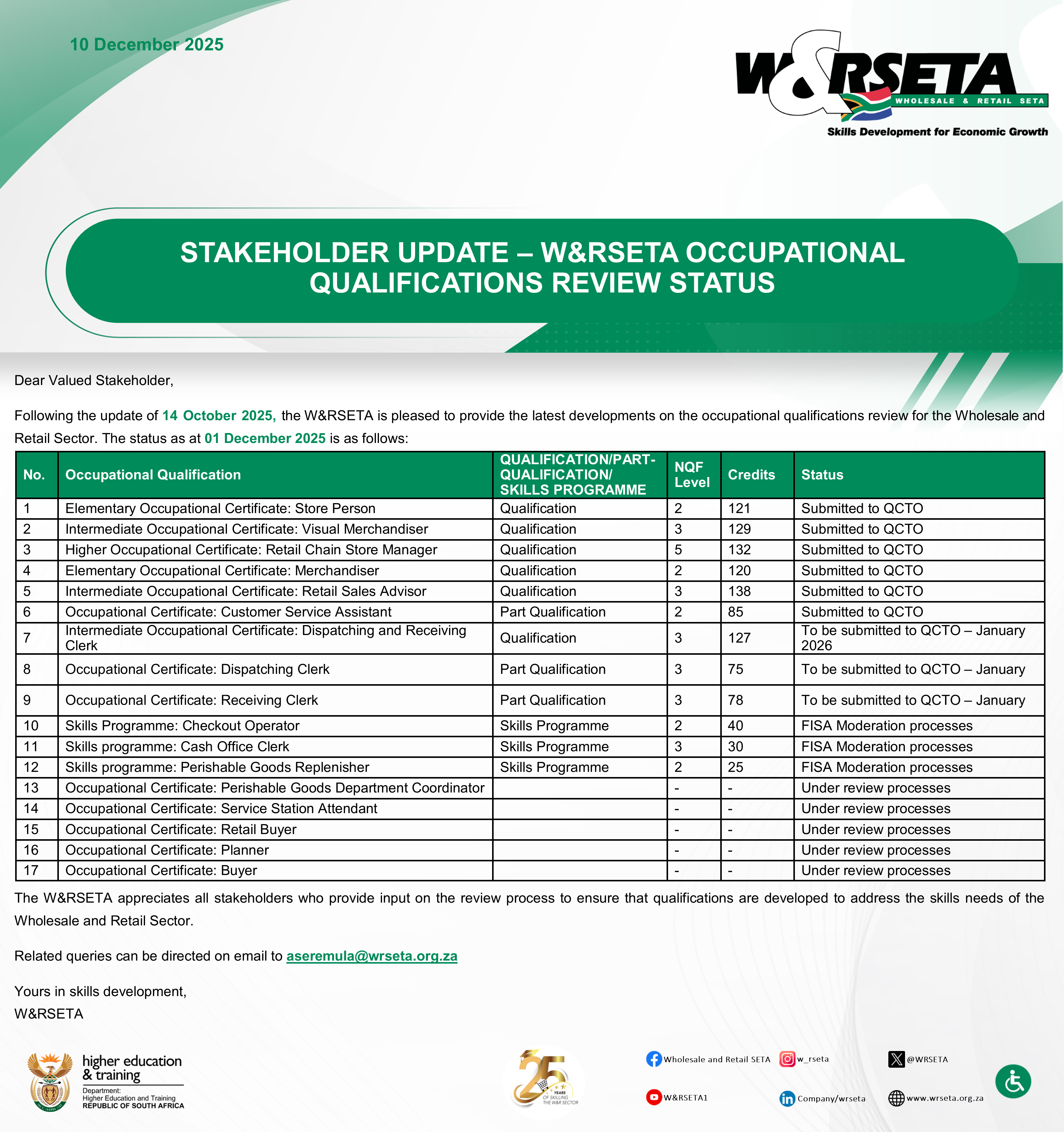 The W&RSETA is pleased to provide an update on the progress made regarding the occupational qualifications review process as at 01 December 2025.